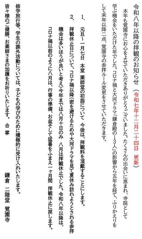 本年も覚園寺にお心をよせていただきありがとうございました。たくさんの出会いに恵まれ、寺院として学ぶ機会をいただけた年でした。コロナ禍と大河ドラマ「鎌倉殿の13人」の影響から五年を経て、ふりかえりをして来年以降二点、覚園寺の参拝ルール変更をさせていただきます。